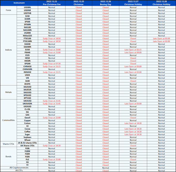 Please be advised that the following instruments’ trading hours and market session times will be affected by the upcoming Christmas holidays.