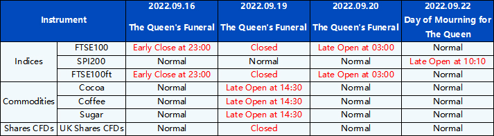 Please be advised that the following instruments’ trading hours and market session times will be affected by the upcoming The Queen‘s Funeral.