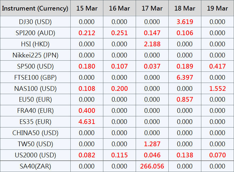 Please be advised that the dividends of the following index CFDs will be adjusted by upcoming ex-dividend dates. The comment for trading index CFDs will be in the following format “Div&<Product Name>&<Net Volume>” which show in the balance after the close of the day before the dividend payment date.