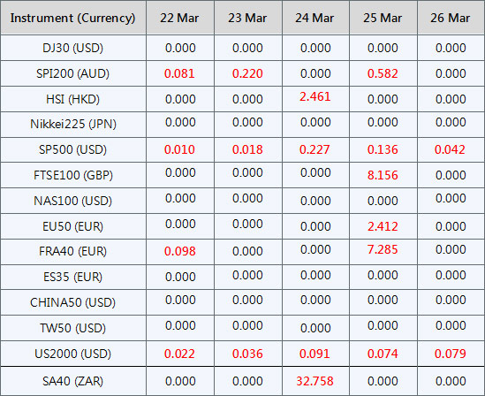 Please be advised that the dividends of the following index CFDs will be adjusted by upcoming ex-dividend dates. The comment for trading index CFDs will be in the following format “Div&<Product Name>&<Net Volume>” which show in the balance after the close of the day before the dividend payment date.