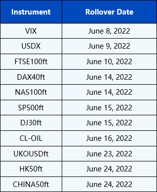 Please be advised that the following CFD instruments will be automatically rolled over as per the dates in the table below. As there can be a pricing difference between old and new futures contracts, we recommend clients to monitor their positions closely and manage positions accordingly.