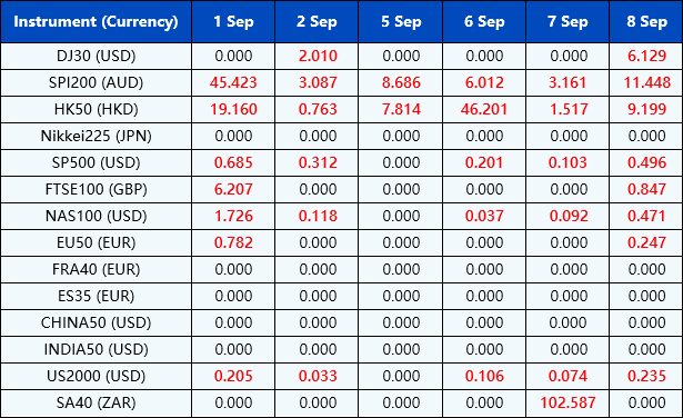 Please note the above data are subject to changes. Please refer to MT4/MT5 for details.