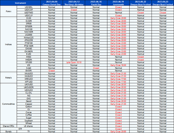 Please be advised that the following instruments’ trading hours and market session times will be affected by the upcoming June holidays.